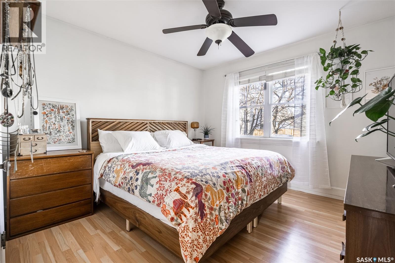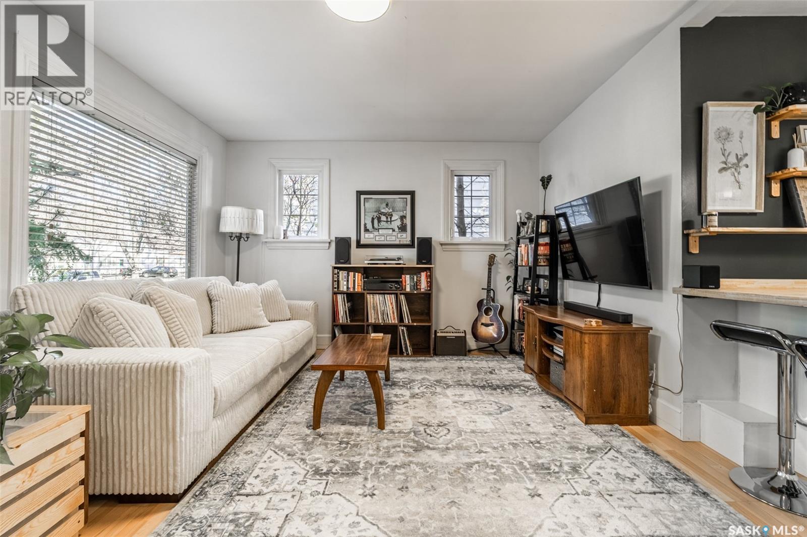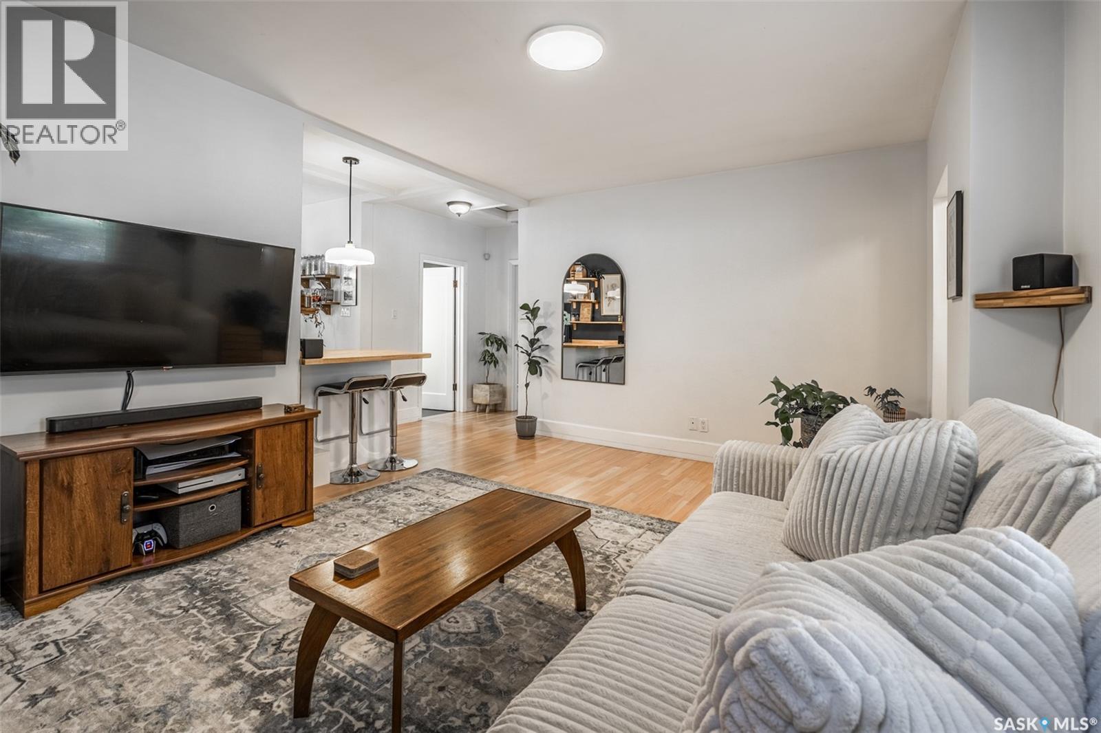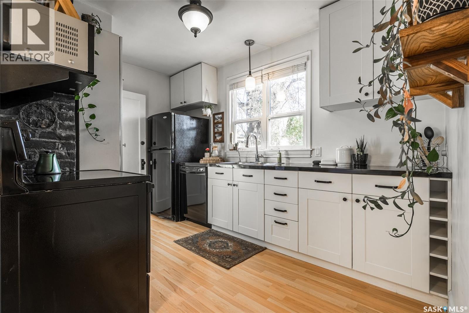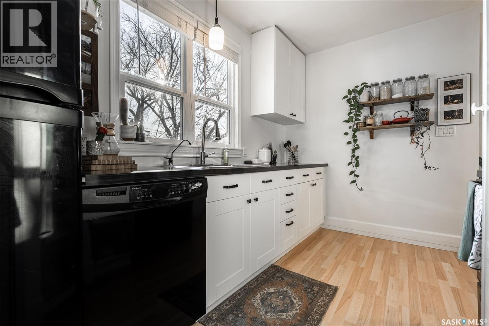 Welcome to 212 4th St east in Saskatoon's Buena Vista neighbourhood. This bungalow was built in 1946 and is only steps away from Buena Vista park. The main floor layout is perfect for entertaining friends or cooking together at the end of the day. With the peninsula to connect the kitchen and living room this will be a well used space. The living room has a big window to allow for lots of natural light. Also on the main floor you will find 2 good sized bedrooms, with the primary bedroom easily able to accommodate a king size bed as well as side tables. There is built in storage/linen closet in the hallway and a cute 4 piece bathroom that has recently been renovated. Downstairs is access to the shared laundry space as well as storage under the stairs. There is also a 1 bedroom suite that could be your mortgage helper, but could also simply be used as a family room with a wet bar. The kitchen is neat and tidy with all the appliances and a dedicated dishwasher for the suite. There are several windows down here for natural light in the living room, a bedroom with a window, and a closet (please note that the window does not meet current egress requirements). In the yard out back there is a patio to have summer dinners with friends, well established perennial beds that have gone to sleep for the winter, and a show stopping double detached garage that is heated and has a dedicated internet line out to it. This is the perfect starter home, an excellent revenue property, or somewhere to downsize into without leaving Buena Vista. As per the Seller’s direction, all offers will be presented on 11/07/2025 5:00PM. (id:4069)